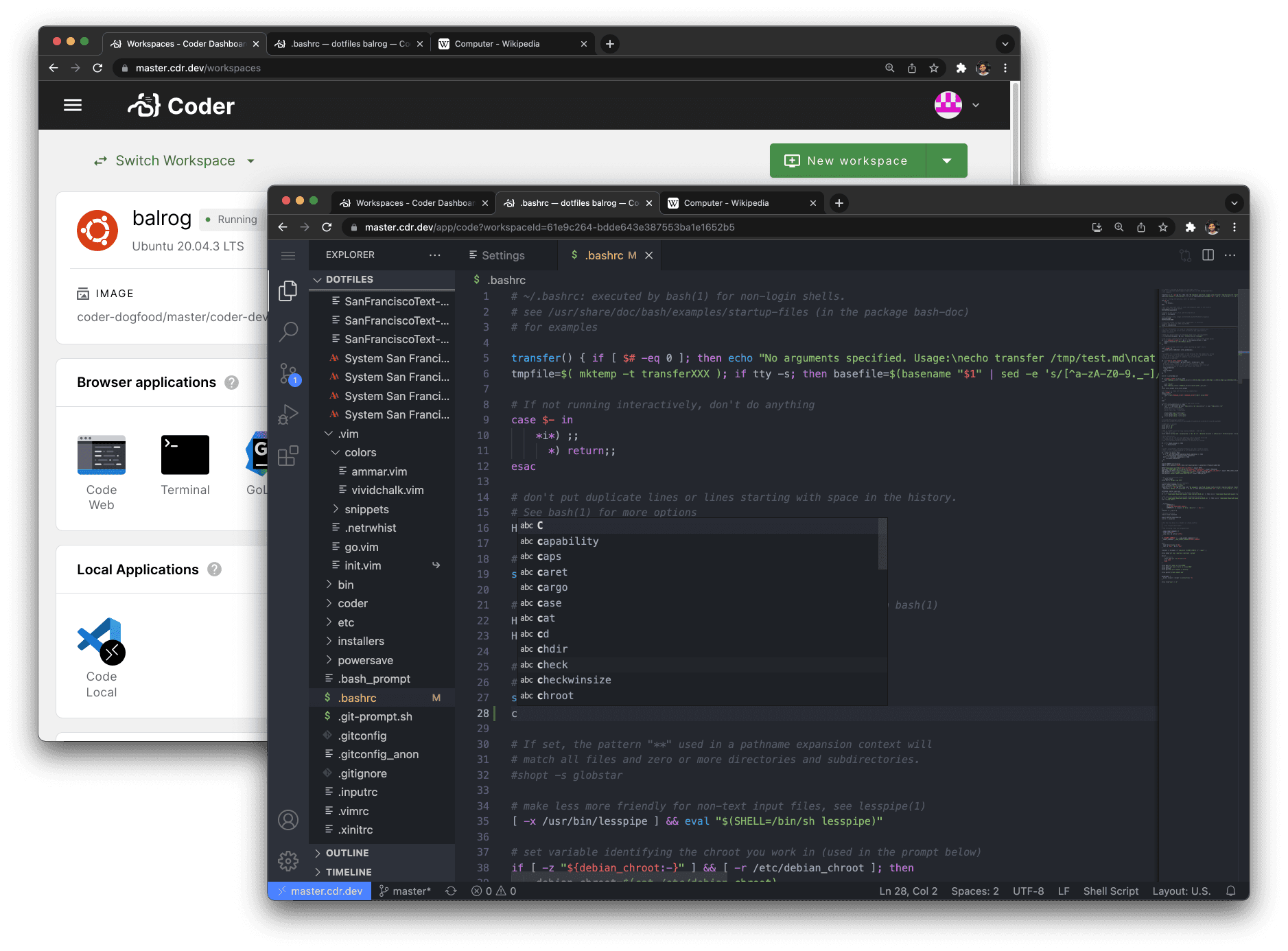 code-server is the primary open source project we maintain. It allows developers to use a browser to access remote dev environments running VS Code. Coder builds upon the success of code-server and adds features designed for enterprise teams including support for additional IDEs and advanced security features.